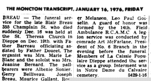 Hospital in Dieppe, New Brunswick and was buried in the Our Lady of Calvary