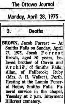Jacob Forest Brown died in Smiths Falls, Ontario