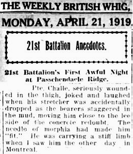 Belgium, Private Challe received shrapnel wounds to his left thigh and was evacuated