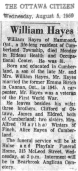 and was buried in the Bearbrook Parish Cemetery, Bearbrook, Ontario