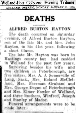 Alfred Burton Hayton died in Welland, Ontario of Broncho