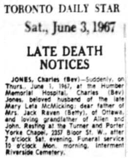 Memorial Hospital in Toronto, Ontario and was buried in the Riverside