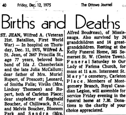 Julia St. Jean, Wilfred’s wife, died in Almonte, Ontario